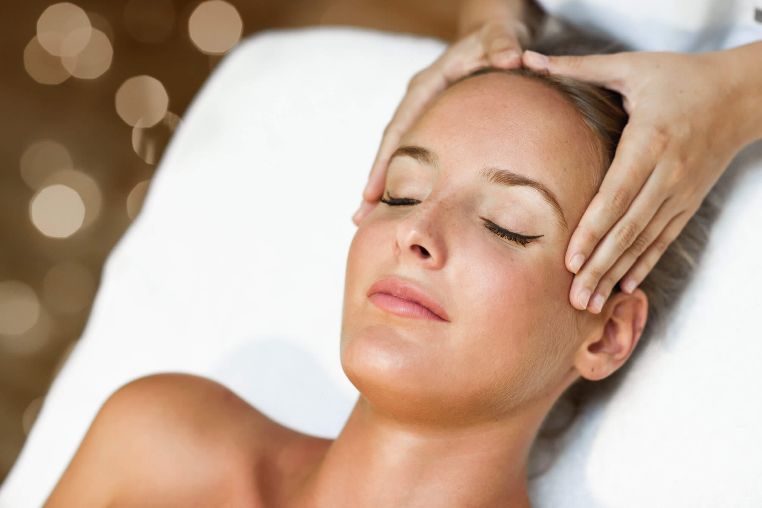Sanfte Massagegriffe werden im Gesicht, Hals und Dekolleté durchgeführt. Dauer: ca. 30–45 Minuten.