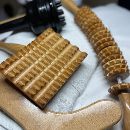 Mit speziellen Holzwalzen wird das Gewebe intensiv, aber angenehm massiert. Eine Sitzung dauert ca. 40–60 Minuten.